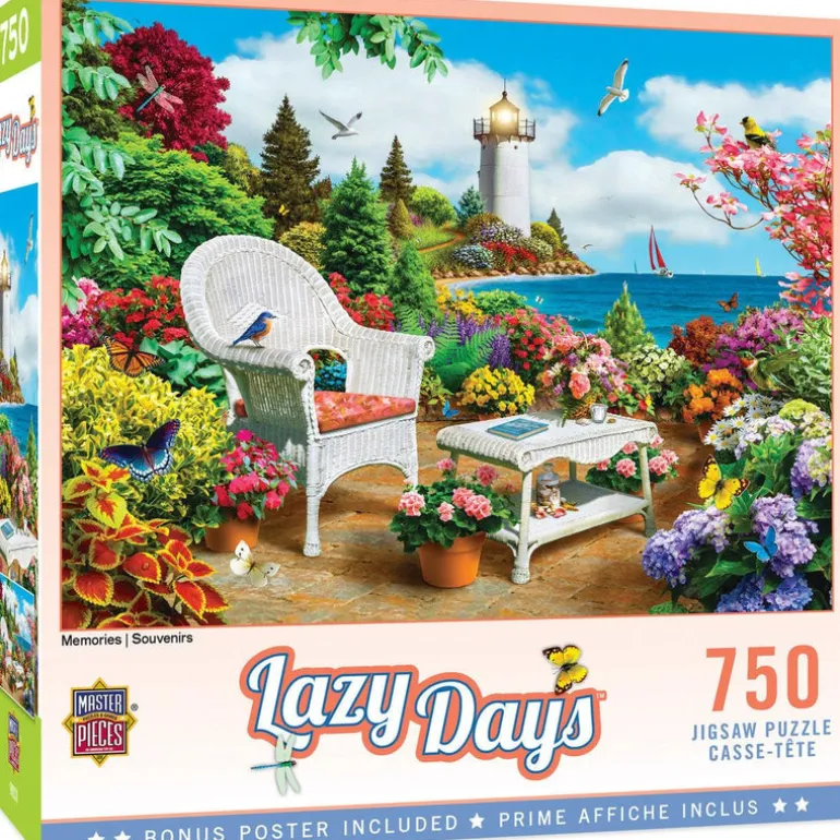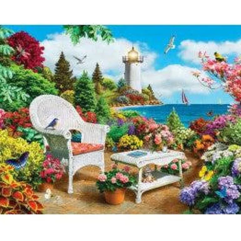 This image features the porch of a beautiful seaside getaway, with a cozy reading chair, a colorful garden, a perfect view of the water, and a magnificent lighthouse in the background. To reduce its impact on our environment, the chipboard used in this puzzle is made of recycled material.