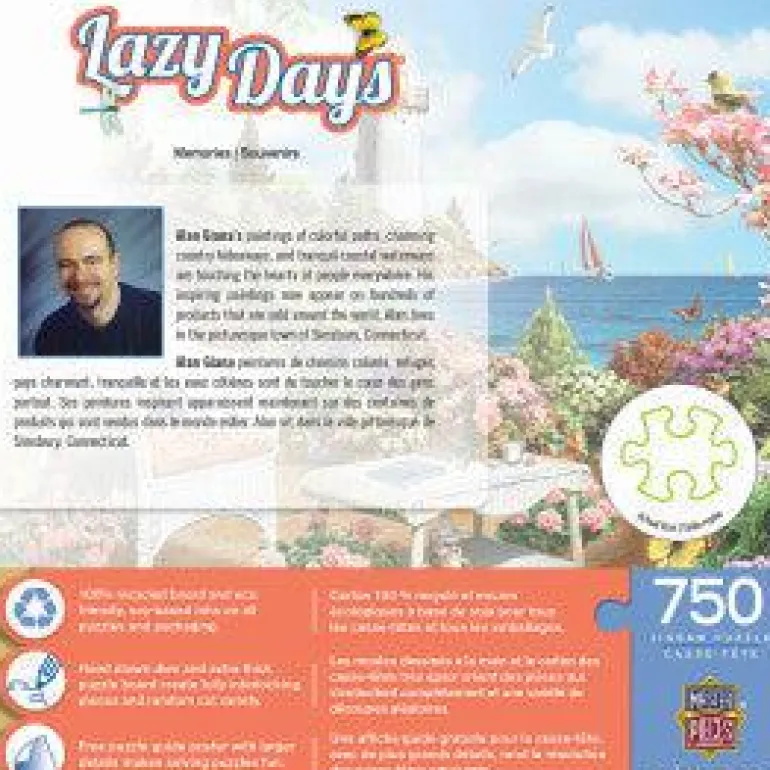 This MasterPieces 18″ x 24″ 750pc Lazy Days Puzzle was created by the talented Alan Giana. Alan Giana’s paintings of colorful paths, charming country hideaways, and tranquil coastal waterways touch the hearts of people everywhere. His inspiring paintings now appear on hundreds of products sold all around the world. Alan lives with his loving wife, Pamela, in the picturesque town of Simsbury, Connecticut. Lazy Days puzzles are full of breathtaking scenery and effortless beauty.