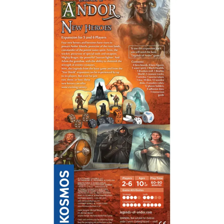 Legends of Andor: New Heroes includes four new heroes for Legends of Andor, and these heroes can be used either with the base game or with The Star Shield expansion. With the new rules in this expansion, you can now play the game with up to six players. The new heroes are: