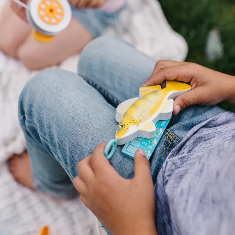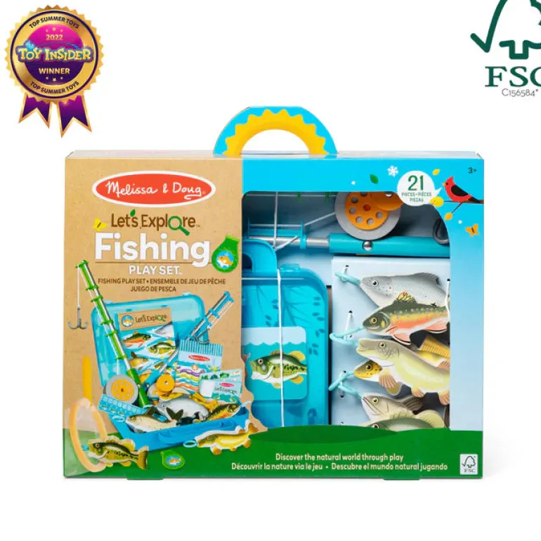 Explore the outdoor experience of fishing with the 21-piece Melissa & Doug Let’s Explore™ Fishing Play Set! Grab the two wooden fishing rods, bait the hooks with pretend worms, then hook and scoop up the six wooden fish! A reversible play mat lets young anglers choose a winter or summer experience. The illustrated fishing guide helps identify fish types, explains fishing basics, and includes fun games. Everything stores in the tackle box for quick and easy cleanup.