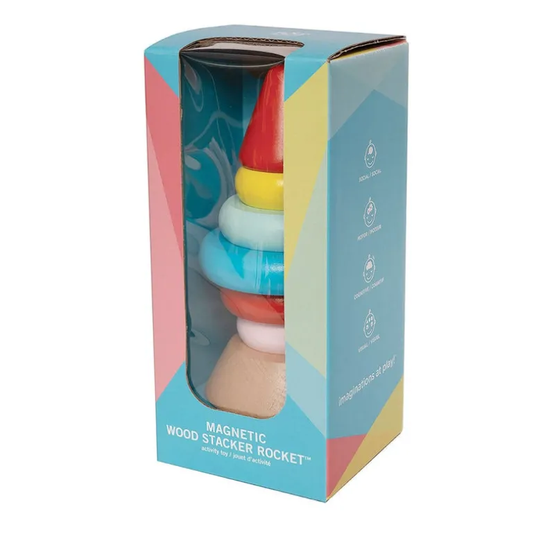 Stack the magnetic wooden pieces atop this sturdy base to create a rocket ship! This seven-piece set encourages motor development, color recognition, and cause and effect learning. Blast off into stacking playtime!