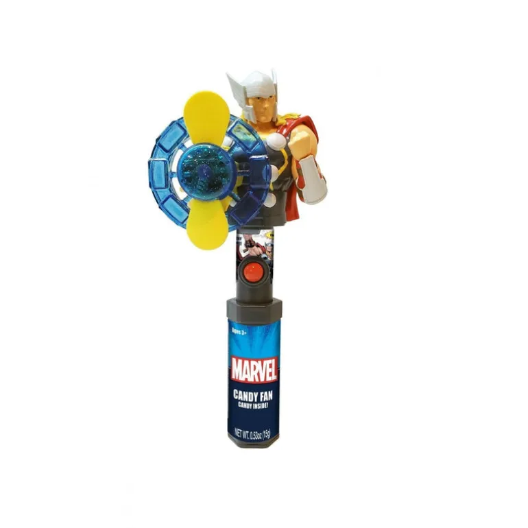 Marvel Avengers Character Fan. Assorted Spider-Man, Black Widow, Black Panther, Loki and Thor sculpted character fans each comes with 0.53 oz candy in the handle.