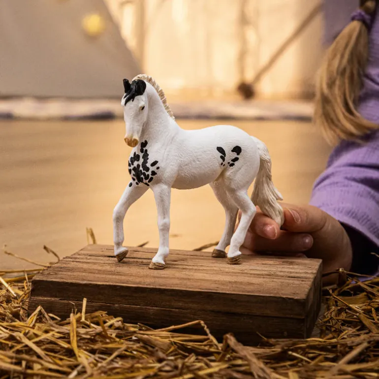 The beautiful Marwari stallion gracefully bows his slender neck and flares his soft nostrils. He pricks up his black, sickle-shaped ears and listens: Is that a whinny he can hear back there? Maybe it’s the Marwari mare calling him. He’ll probably trot over there straight away. The little Marwari foal is also close by. With the three of them together, the horse family is complete. Perfect!