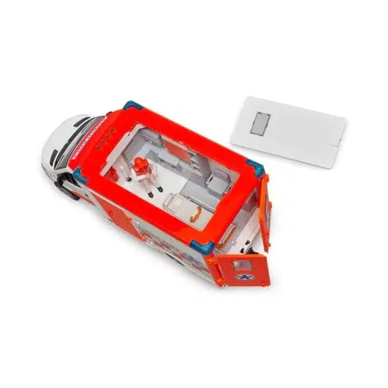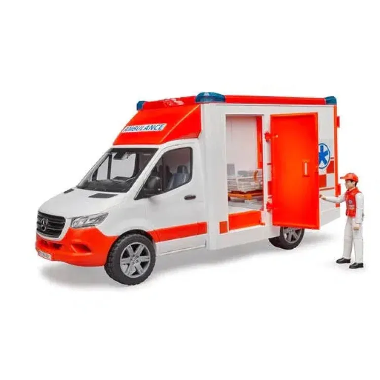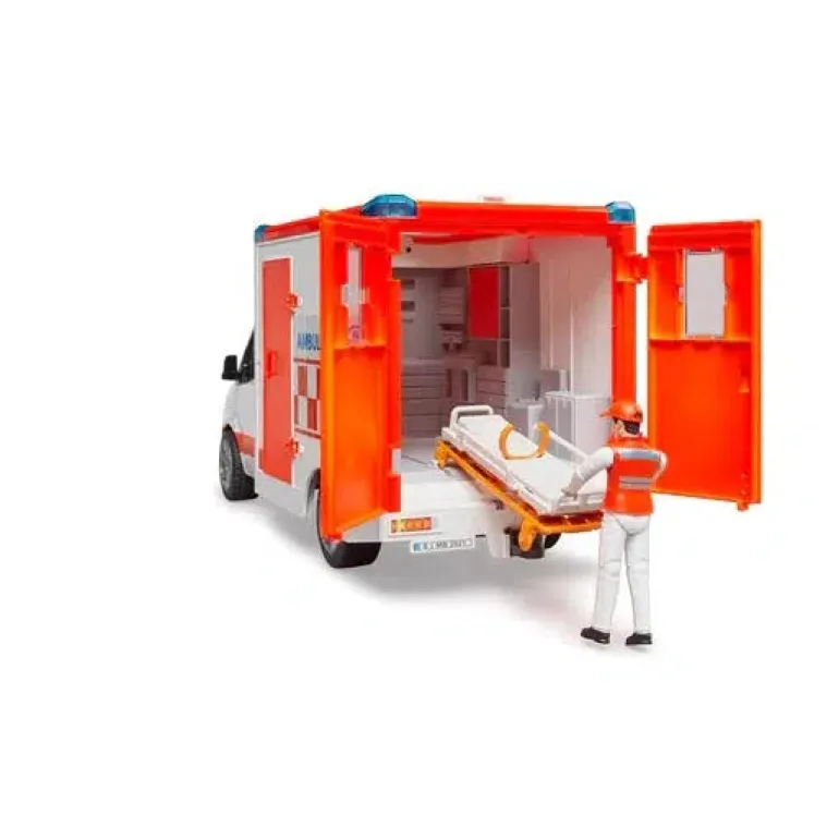 Pioneering, efficient, reliable – this is how Mercedes Benz describes the new Sprinter. The latest generation Sprinter continues to be the versatile and popular transport professional. BRUDER’s extensive range includes the latest sprinters in a wide range of designs.Emergency service vehicles are pivotal to BRUDER. The new MB Sprinter ambulance has now been added to round off the range. When recreating an emergency situation, this vehicle with its many functions is paramount. The paramedic (included in the delivery scope) can access the cab using the opening doors. Thanks to the new light and sound module featuring various siren signals and lighting functions, the ambulance will quickly and safely reach any incident. The miniature paramedic gains access to the cutting-edge treatment area through the opening rear doors and side doors as well as the removable roof module. Any bworld figure can be safely transported on the height-adjustable stretcher that moves in and out of the vehicle, fully in line with BRUDER’s motto – just like the real thing.