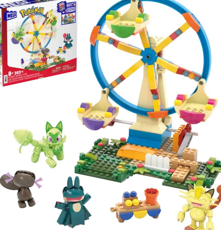 Take your Pokémon team for a spin with the Ferris Wheel Fun building set. Place Sprigatito, Meowth, Paldean Wooper, and Munchlax in the wheel then turn the crank to activate the set’s motion. Combine with other Adventure Builder sets to create an expanded Pokémon world with motion; each sold separately.