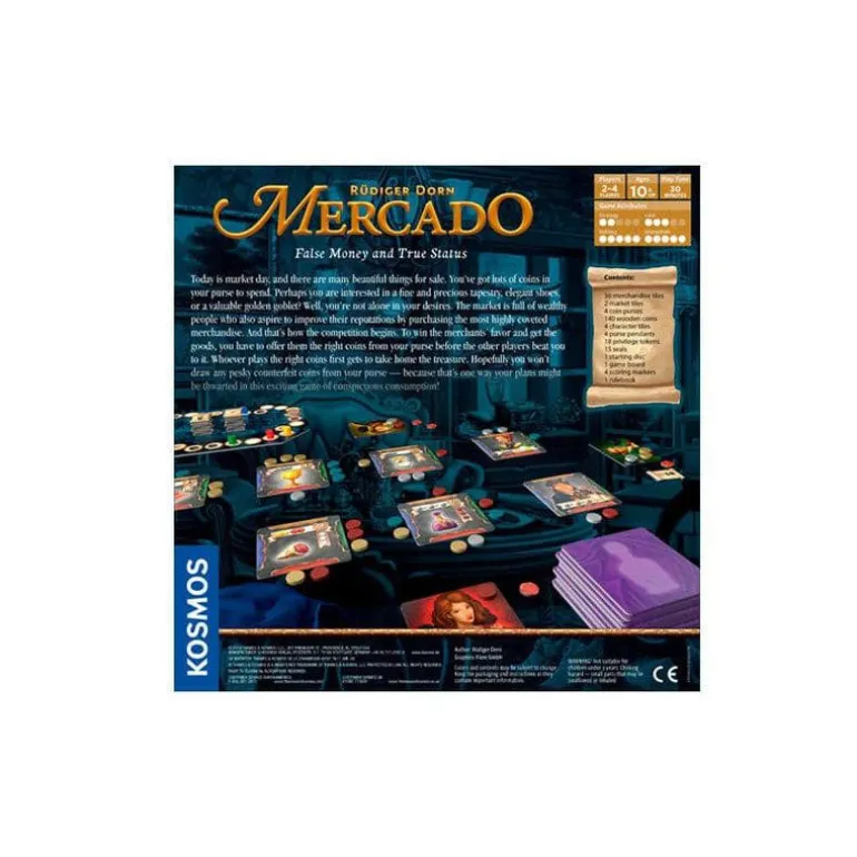 As players in Mercado, you assume the roles of wealthy members of upper-class society. To raise your social status, you must buy luxury goods. So you shop around the market for expensive baubles, finery, shoes, jewelry, and perfume — anything that will increase your reputation among the other snobs and social climbers.
