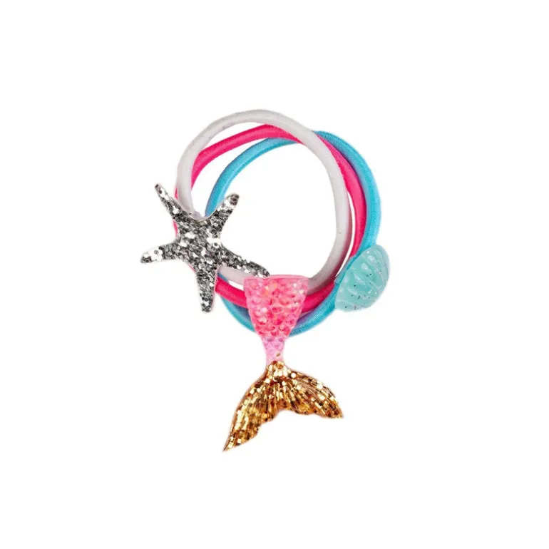 Don’t let your hair get in the way of your next mermaid adventure! This set of 3 hair elastics are perfect for any under the sea do. Each elastic features a glittery pendant: a silver glitter star, a gold and pink glitter mermaid tail, and a teal blue glitter sea shell.