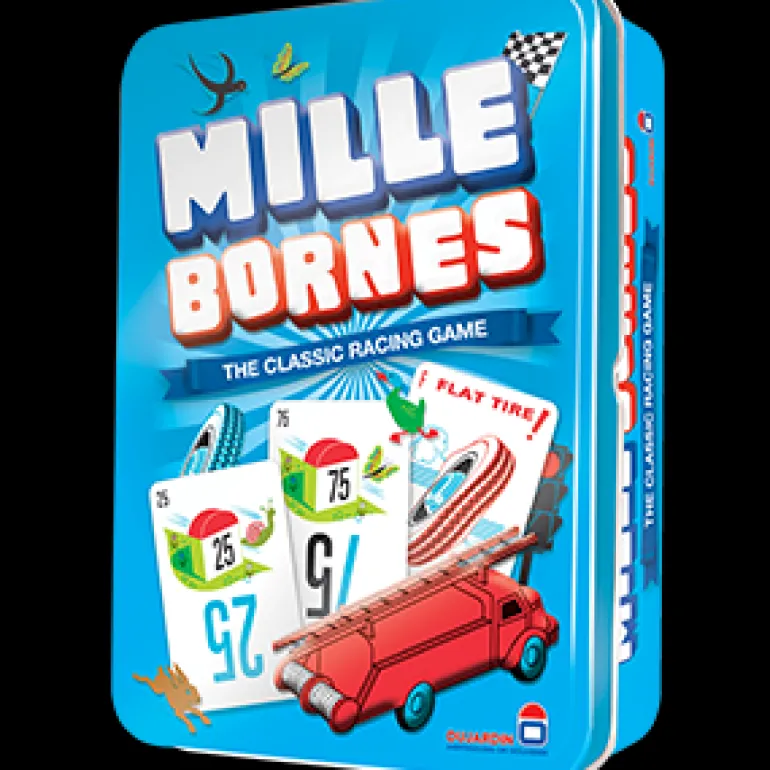 One Thousand Milestones. On French roads there were small marker stones giving the distance in kilometres to the next town. In this famous old French card game, players compete to drive 1000 km, dealing with hazards along the way. Draw a card to your hand, play or discard. You must lay a green traffic light to start, play cards showing mileage, dump hazards (flat tire, speed limit) on the other players, remedy hazards (spare tire, end of limit) from yourself, play safety cards (puncture proof), and try to be the first to clock up the distance.