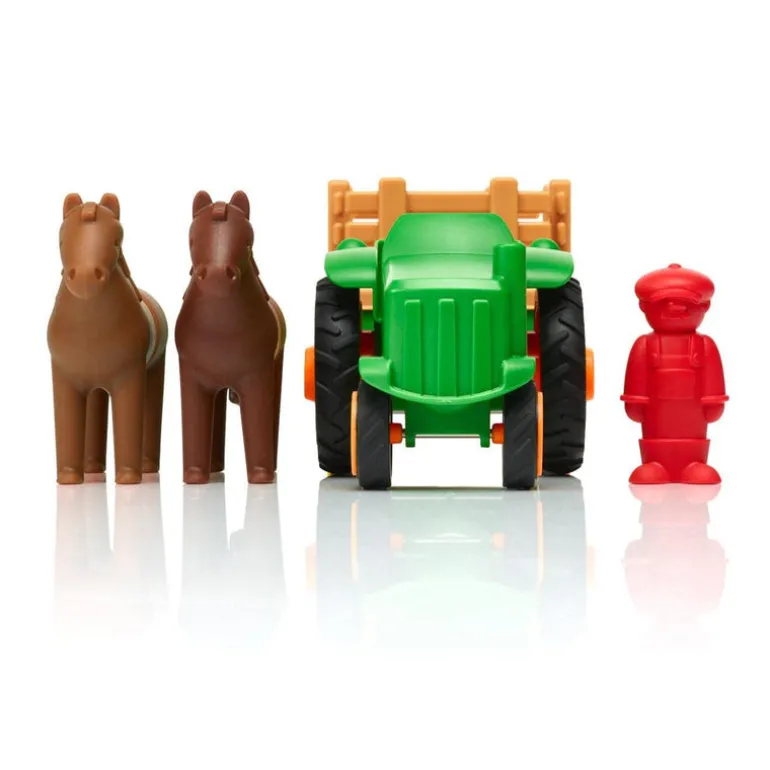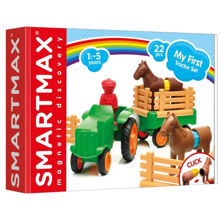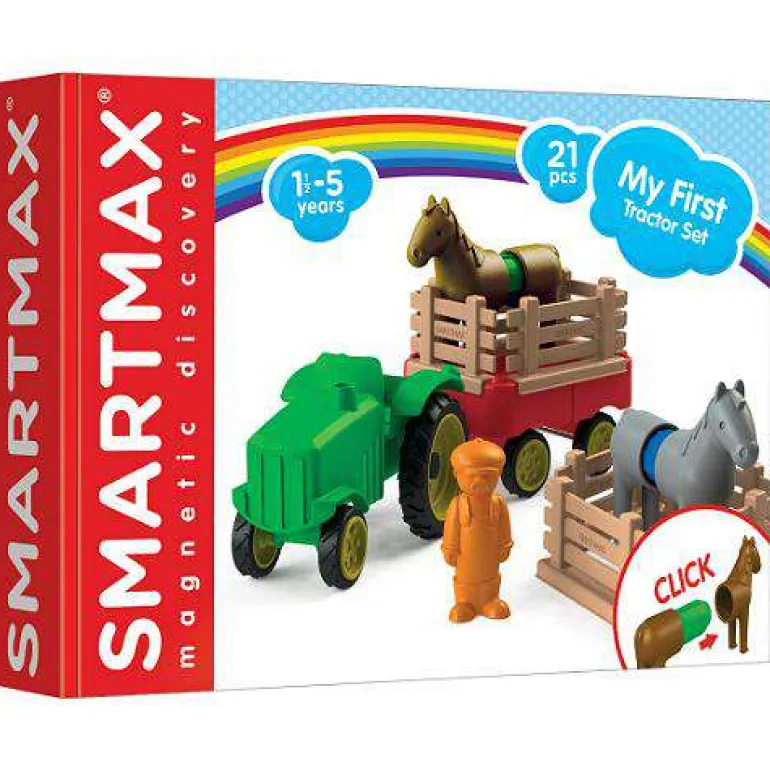 Young children can safely discover the magic of magnetism with the SMARTMAX “My First” collection. Its time for work…and fun! My First Farm Tractor enables kids to build a moving tractor and includes a farmer and two horses! Contents: 2 Large SmartMax bars, 2 Small SmartMax bars, 1 ball, 1 farmer, 4 horse pieces, 2 – piece tractor, 2 – piece trailer, 6 large fences, and 2 small fences.13.5″ x 9.5″ x 2.9″Build a magnetic tractor and move around the farm22 pieces including tractor, trailer, farmer, and two horsesOversize strong safe pieces