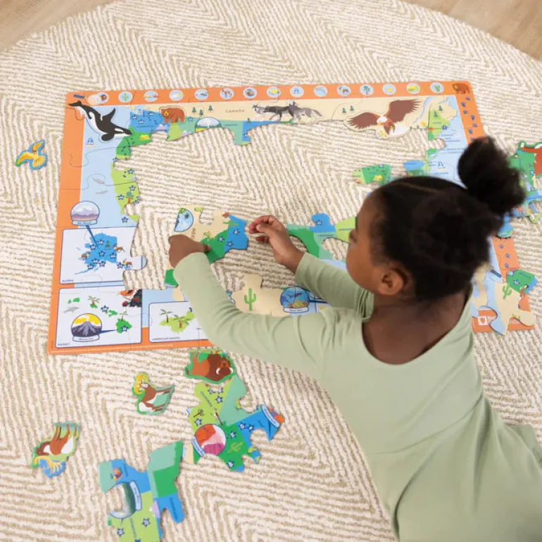 Take an imaginative journey across the U.S.A. and learn about 63 national parks through puzzle play! Piece together the 45-piece jumbo cardboard jigsaw puzzle, featuring special animal-shaped pieces, search-and-find activities, and animal track identification along the border. Designed to make learning fun, states and points of interest are labeled, and a key inside includes an animal ID guide, park identification, and the search-and-find answers in English and Spanish! Completed puzzle is approximately 3 feet by 2 feet (91.4 cm x 61 cm). Puzzle play encourages fine motor and problem-solving skills and promotes concentration, memory, and independent learning. Melissa & Doug® is proud to support the National Park Foundation with a million-dollar minimum donation over three years.