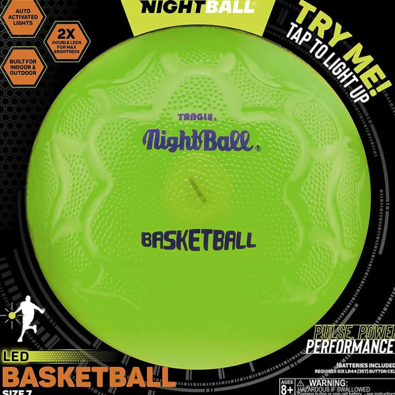 SPECIFICATIONS: Contains (1) Tangle NightBall Glow Basketball. BPA-free, latex-free, phthalate-free, non-toxic TPR material. Motion activated lights, regulation size and bounce. Water-resistant and floats, easy access battery replacement.