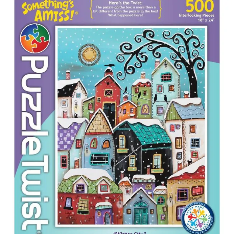 Karla Gerard is a self taught folk artist from Waterville, Maine. She has been drawing since she was a teenager and has been selling her art online since 2002. Karla’s whimsical paintings are a reflection of her own youthful, upbeat and kind of quirky personality. We’re super excited to include Winter City within our Something’s Amiss!® line of jigsaw puzzles.