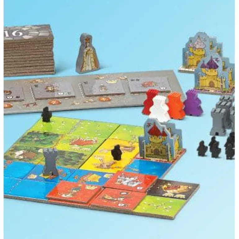 You are a royal, seeking new lands to expand your ever-growing kingdom. Explore and conquer the different terrains, and develop the best and richest territories for your people. Scour lands full of wheat fields, forests, grasslands, swamps, mines, and towns, diversifying your kingdom’s riches along the way. Tax the lands wisely to fund the construction of your towns, pick the buildings you erect carefully, and try to win the Queen’s favor – all while making sure your plans aren’t foiled by the Dragon’s flame. Make sure to strategize and acquire carefully, as others are also competing for the same lands, a stake in the riches, and the heart of the Queen!