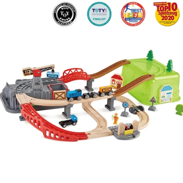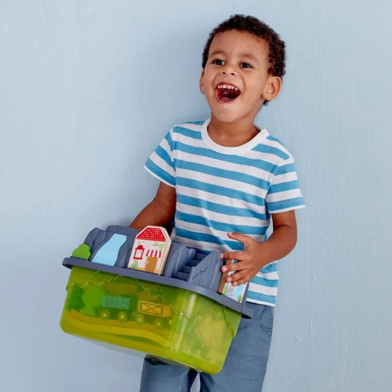 This great train set lets you build your own town! Unpack everything from the storage box then use the lid to create a cool little town for your passengers and cargo to move through!