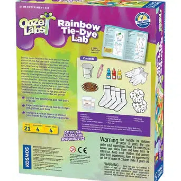 Science meets fashion in this make-your-own tie-dye science lab. Tie-dye two fabric scrunchies and two pairs of socks using non-toxic red, blue, and yellow dyes. Mix them up to create all the colors of the rainbow — red, orange, yellow, green, blue, and purple! A full-color manual guides you through the steps for creating different types of groovy tie-dye patterns. Or invent your own method! Create your dye solution like a scientist by using the included measuring beaker. As you go, learn about the science and art of dyeing fabrics. Explore color mixing and learn about why your eye sees colors. Look fabulous in your new tie-dye gear and feel fabulous about all the knowledge you gained!