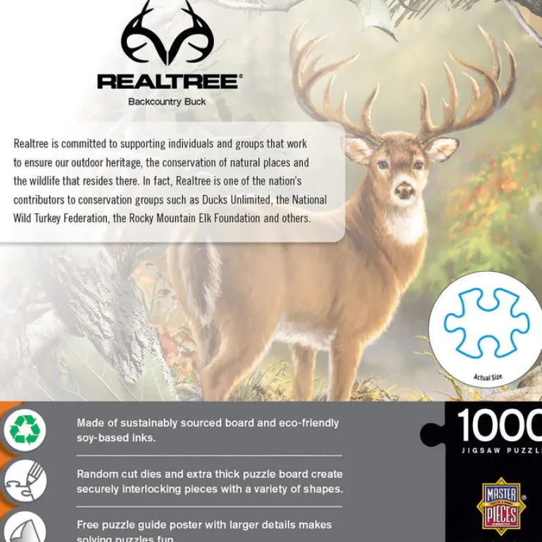Hand painted artwork by Dona Gelsinger is combined with exact Realtree patterns to create a one-of-a-kind image. To reduce their impact on our environment, the chipboard used in these puzzles is made of recycled material.