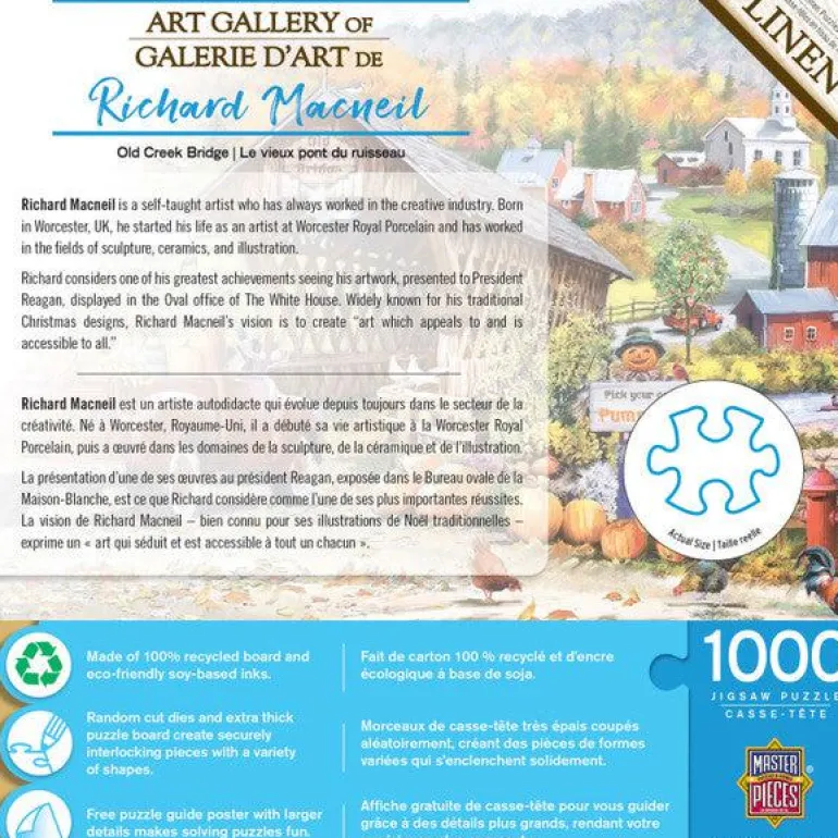 These MasterPieces 19.25″ x 26.75″ 1000pc Richard McNeil puzzles. The Old Creek Bridge leads to a quaint farm town past the river. Linen Finish on Packaging and Puzzle reduces and glare and creates a timeless classic look.