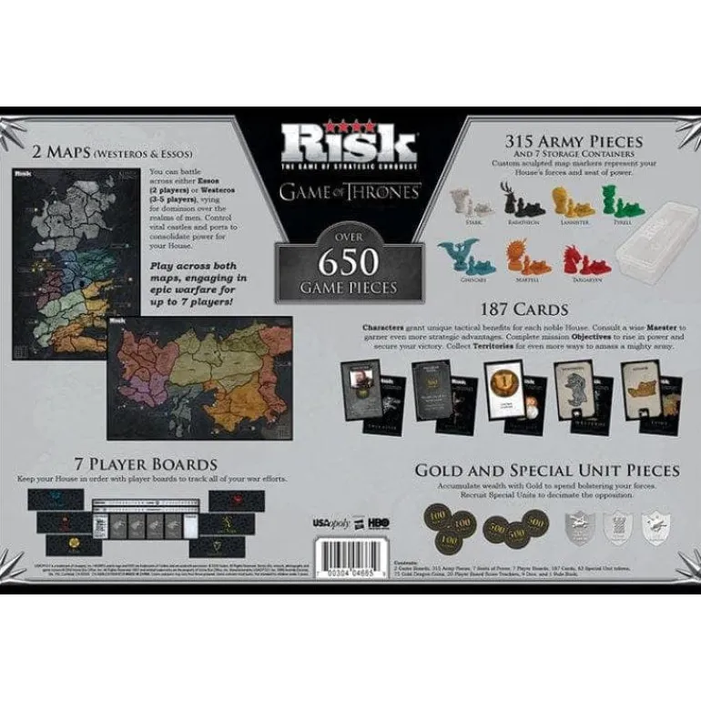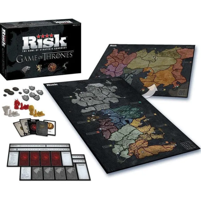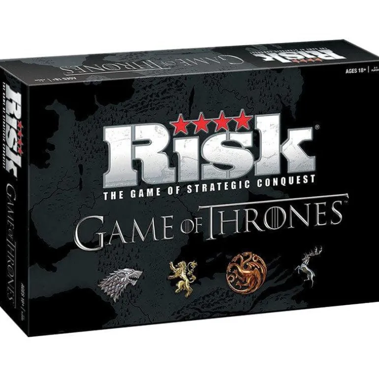RISK®: Game of Thrones™ Edition Game escalates Risk, the Classic Games of strategic conquest, to an epic level of chaos and war in a battle for the Iron Throne. Featuring striking game packaging, two custom-designed game boards, three ways to play, seven finely sculpted armies, and more than 650 total pieces, this game of strategic conquest will test the wits and bravery of both Risk® and Game of Thrones™ fans. So, ready your swords for battle as you vie for domination of the Seven Kingdoms and beyond, because in RISK®: Game of Thrones™ Edition Game only one victor can sit on the Iron Throne.