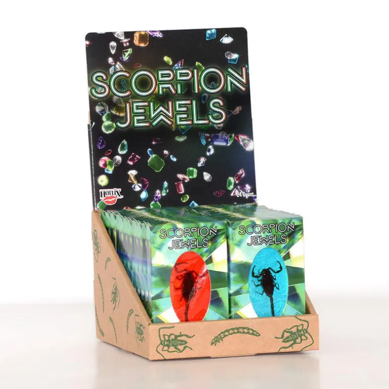 Real scorpion encased in fruity flavored hard candy. Net. wt. 1.24oz (35g).