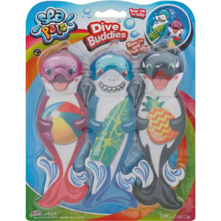 Drop ’em in water. Dive in and catch ’em! They sink! Weighted fabric. Toss Dive Buddies in pool and dive in after them! See how quickly you can collect them and return to the surface.