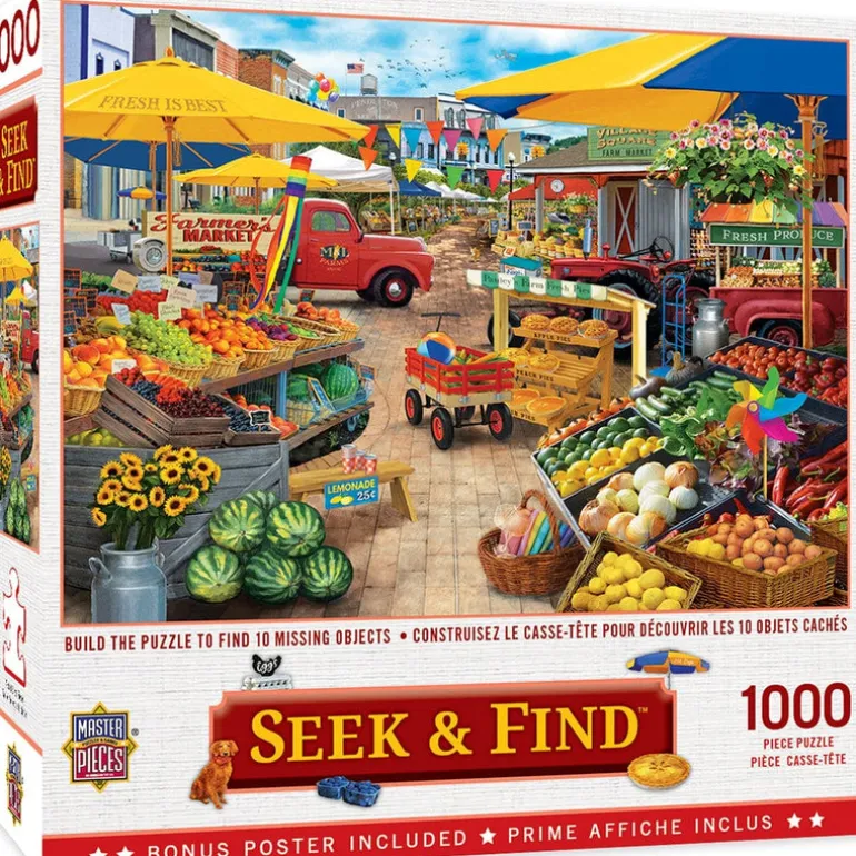 This MasterPieces 19.25″ x 26.75″ 1000pc Seek & Find Puzzle has hidden objects you will discover as you assemble the puzzle. This Market Square collection is veggies and treats is filled with surprises.