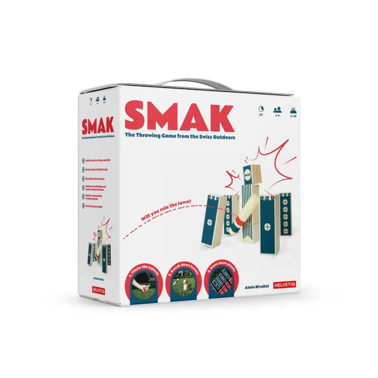 Direct from the land of parks, mountains and lakeshores, Smak is the new exciting throwing game for all ages and nearly all surfaces. Just form teams, set up the towers, throw the batons to knock them down, cancel out your opponent‘s throws and score more points to win!