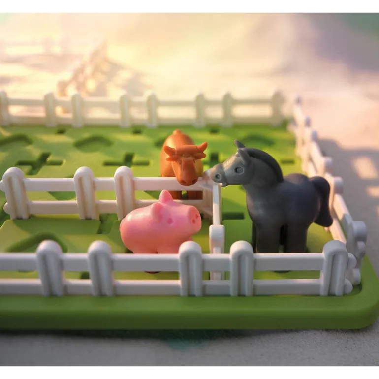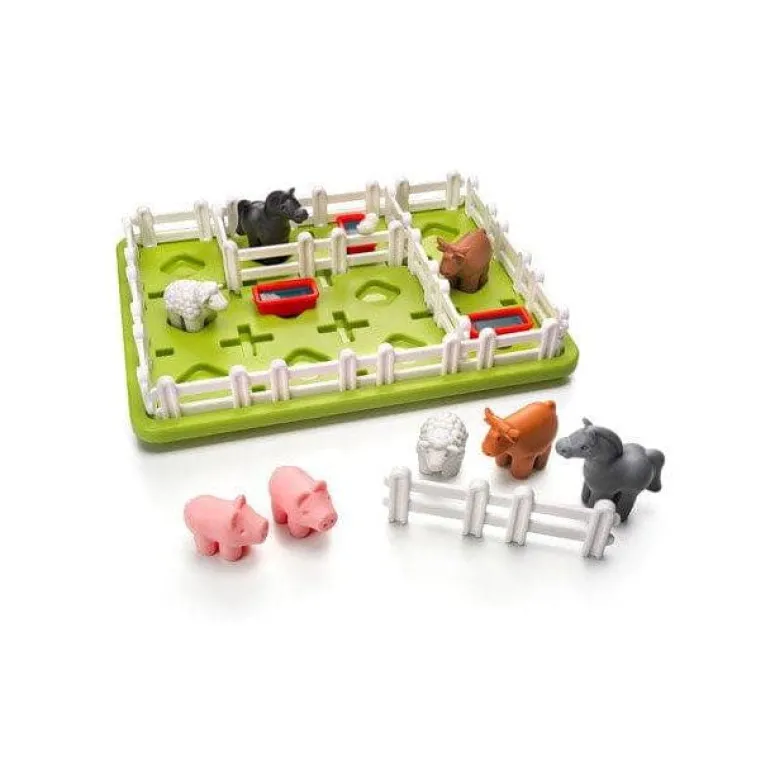 - Game board with 4 fixed fences, 2 horses, 2 cows, 2 sheep, 2pigs, 3 water troughs, 3 fences, booklet with 60 challenges and solutions
