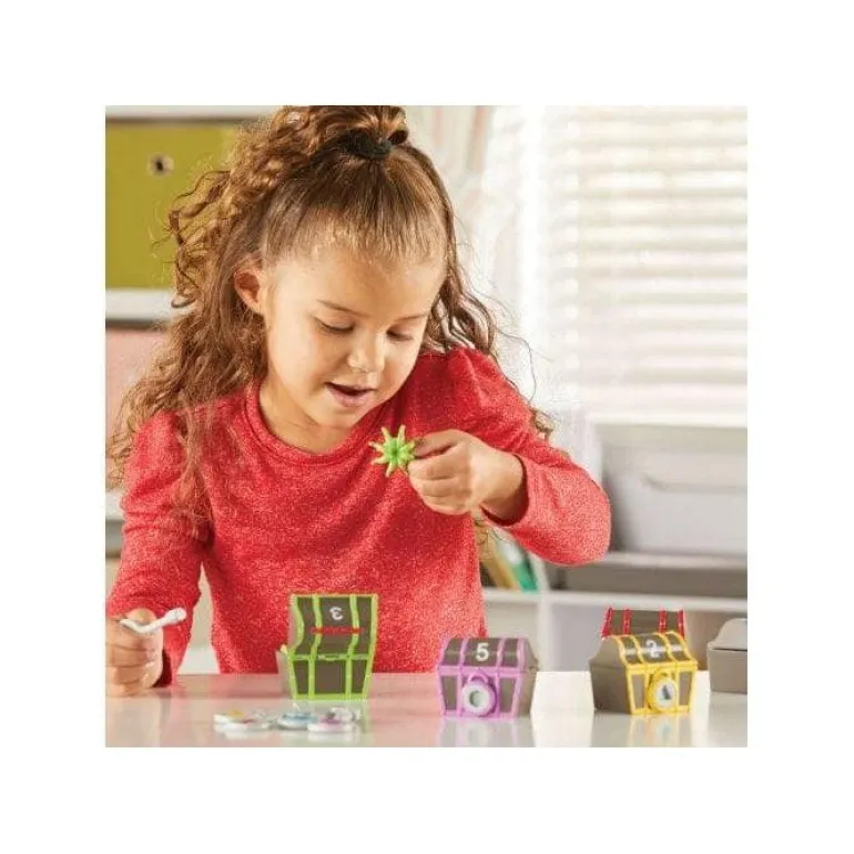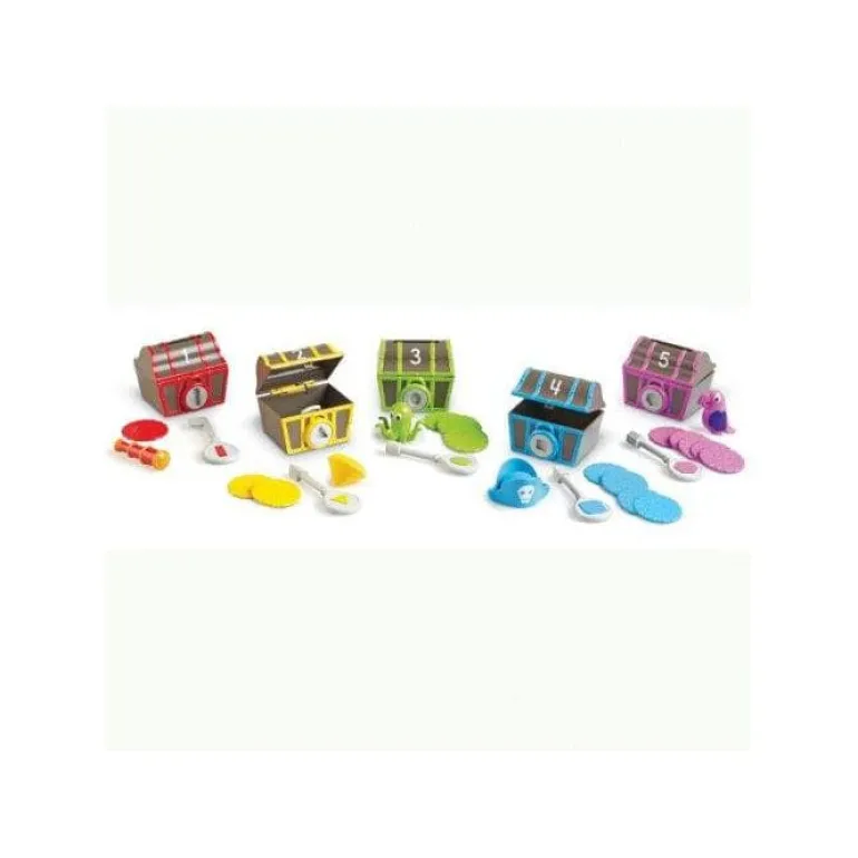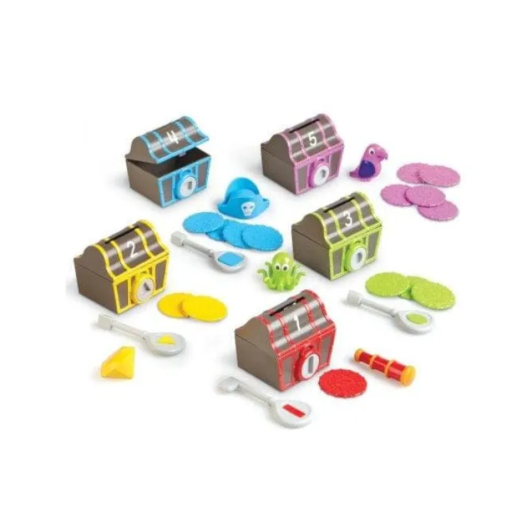 Unlock fine motor skills with 5 numbered treasure chests which come with 5 matching shaped keys and a surprise inside each one! The set also includes coin counters that add to the matching, sorting, and counting fun!