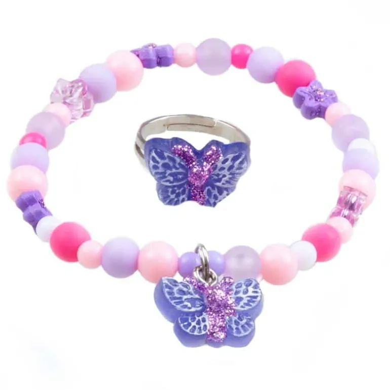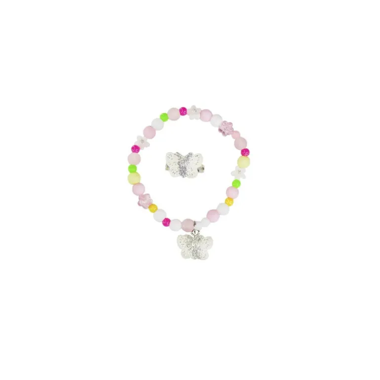 Available in 3 colour styles, this adorable 2 piece set is perfect for any little butterfly princess. This bracelet and ring set feature a large glitter accented butterfly pendant and matching adjustable ring. The flower beads even have glitter centers because the ‘Glitter’ is in the details!