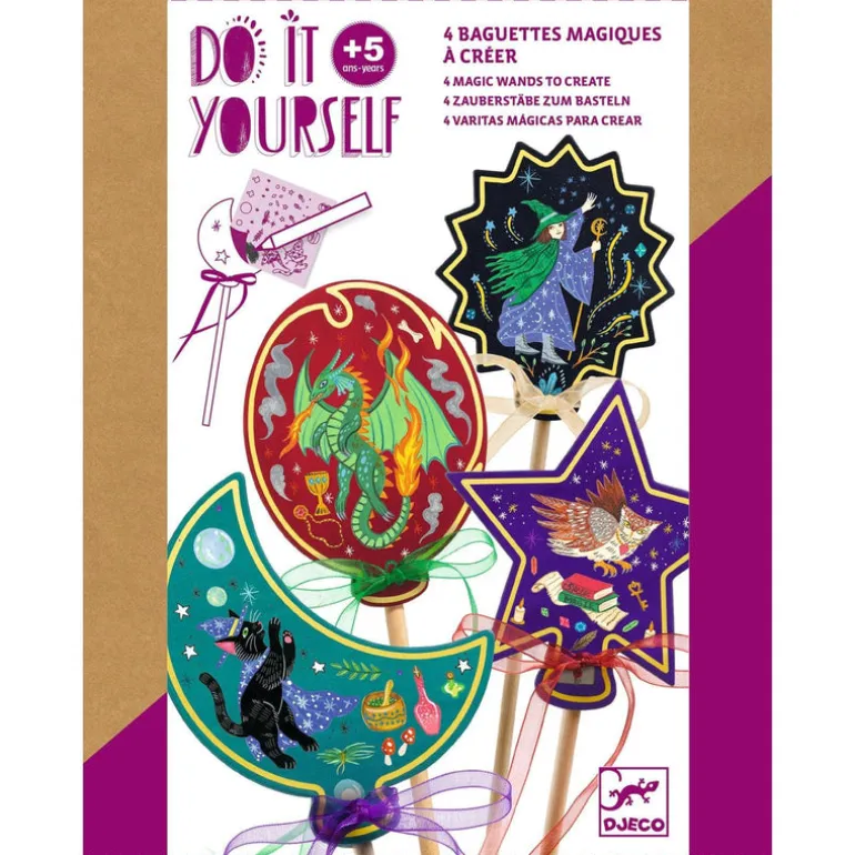A creative kit for making 4 magic wands. Children assemble and decorate the magic wands using the transfers, stickers, and ribbons provided. Once assembled, the wands are ready to cast spells and shine in the night thanks to their glow-in-the-dark finish…it’s magic!