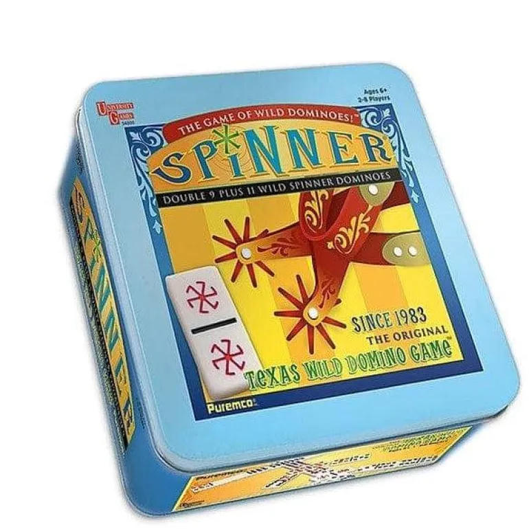 Sometimes when you’re playing dominoes, things can get a little wild! Spinner is the only domino game with wild dominoes that can be played as any number. A dynamic Double 9 Domino game plus 11 Spinner wild dominoes, Spinner is a great combination of other domino games, for a fun and exciting variation on traditional dominoes. An exciting and extremely popular game invented by Dr. & Mrs. Edna F. Graham of Abilene, Texas in 1983, Spinner has been exclusively manufactured and distributed for more than 30 years by Puremco Inc., which is now part of the University Games family. This sturdy tin contains 55 standard size dominoes with colored dots and 11 extra Spinner dominoes emblazoned with the bold Spinner symbol, plus a Spinner score pad and instructions.