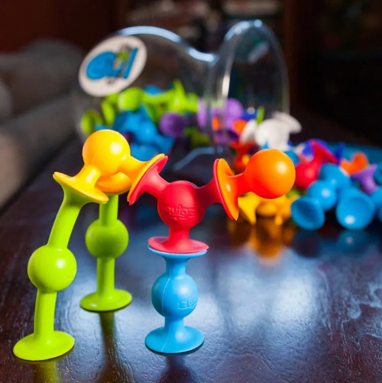 They are flexible fellows and committed joiners. Squigz and fellow Squigz have one chief enterprise – creating things. Willingly, they assemble to become rockets, vehicles, a cushion for the cat, jewelry… they thrill in uniting as a ginormous octopus or squid.