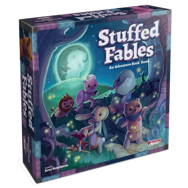 Stuffed Fables is the first “AdventureBook Game”, a new product line from Plaid Hat Games in which all of the action takes place in the unique storybook — a book that acts as your rules reference, story guide, and game board, all in one! Each adventure in the game takes place over several pages of the immersive AdventureBook. The book opens flat onto the table to reveal a colorful map or other illustration central to playing the game, with choices, story, and special rules on the opposite page.
