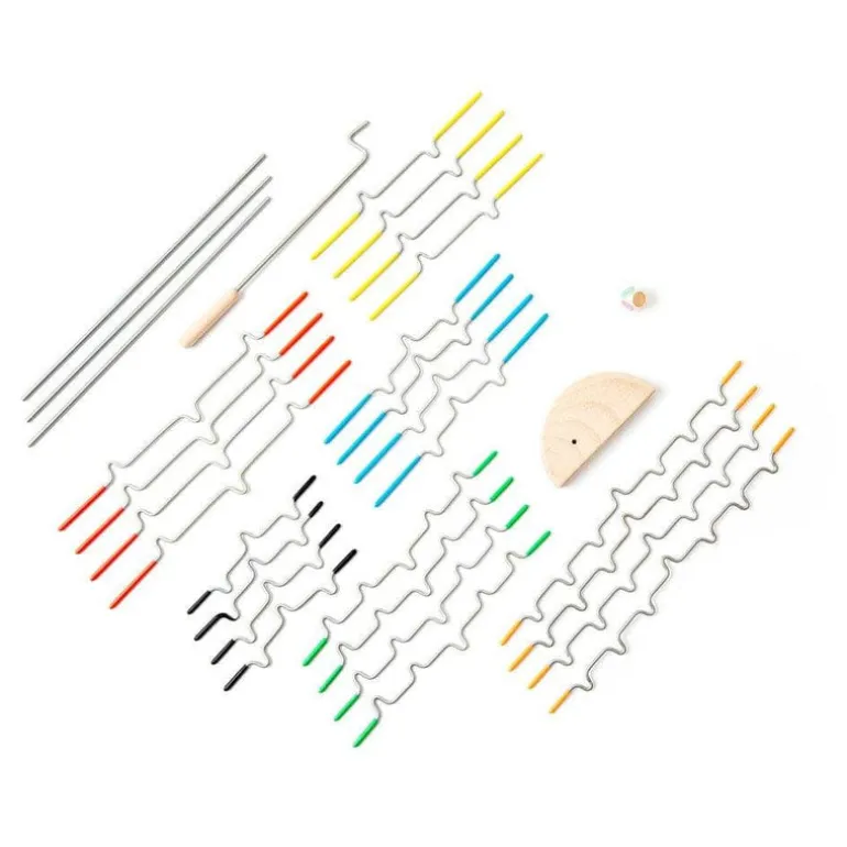 - Includes 24 game rods, wooden base, 4 frame rods, colored die and wooden connector