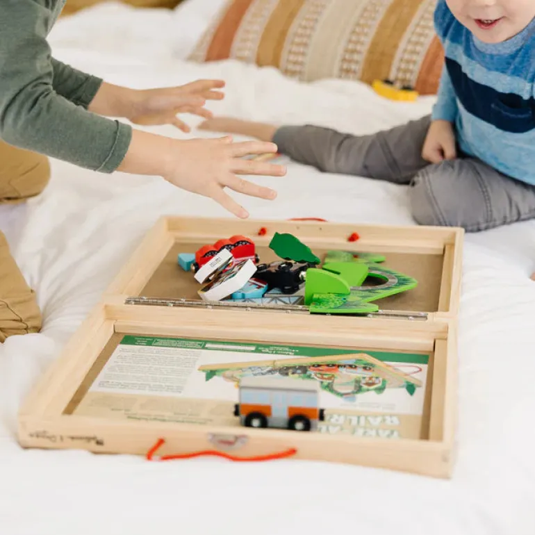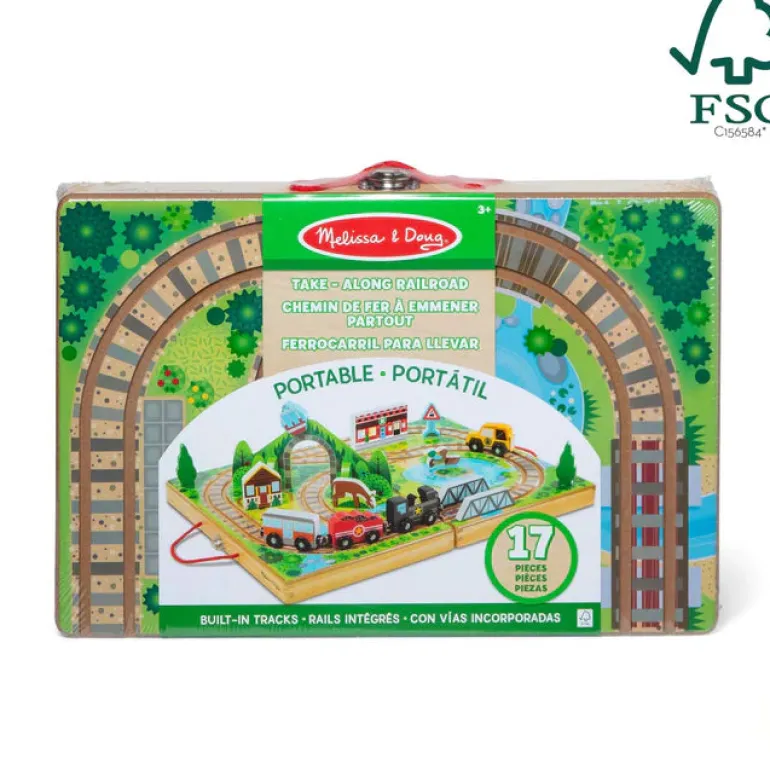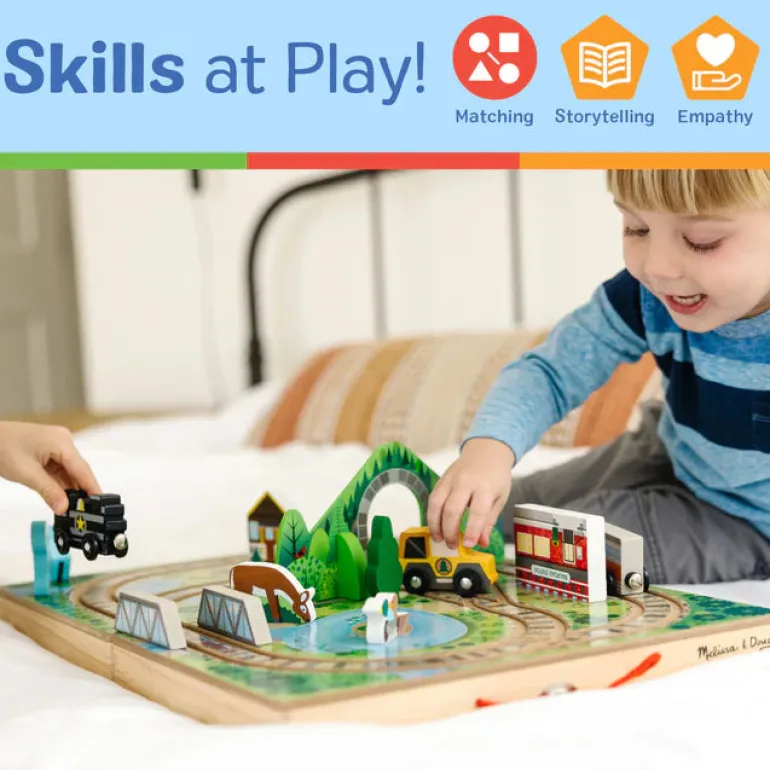 Built-in tracks, colorful scenery, and fun play pieces let kids take their imaginations for a spin . . . and take playtime anywhere they want to go! Unfold the sturdy wooden case to create an illustrated play surface with built-in train and road tracks for the three wooden wheeled trains and a park ranger vehicle. Set up a bridge and a mountain tunnel with a gondola that slides across the top! Wooden play pieces include buildings, animals, trees, and a railroad crossing sign to enhance imaginative storytelling. All the pieces store in the fold-up case with convenient carrying handle for easy cleanup and travel (there’s plenty of room to add other toys, too!).