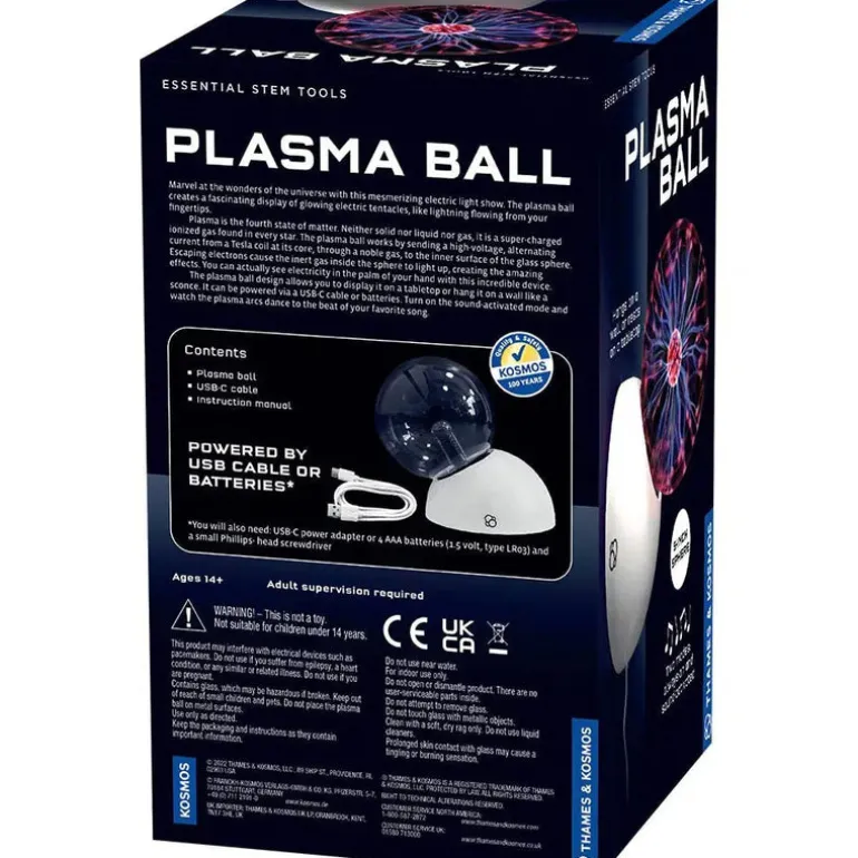 Plasma is the fourth state of matter. Neither solid, liquid, or gas, it is a super-charged ionized gas found in every star. The plasma ball works by sending a high-voltage, alternating current from a Tesla coil at its core, through a noble gas, to the inner surface of the glass sphere. Escaping electrons cause the inert gas inside the sphere to light up, creating the amazing effects. You can actually see electricity in the palm of your hand with this incredible device.