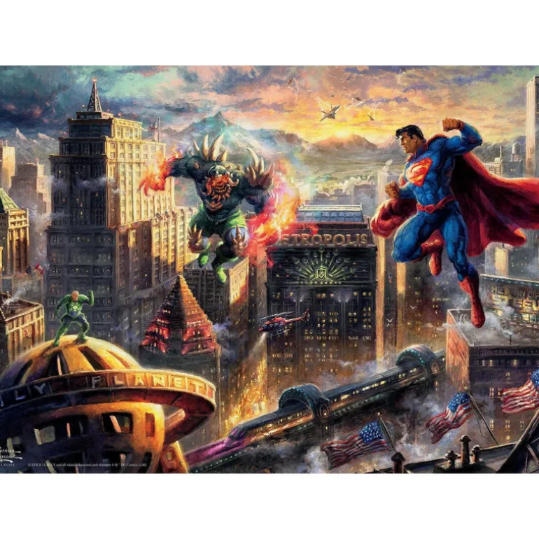 This 1000 piece puzzle features a Thomas Kinkade painting of the superhero, Superman, from the DC Comics world. In Superman – Man of Steel, the last son of Krypton meets his two greatest enemies Doomsday and Lex Luther, who can be seen standing on top of The Daily Planet with his vengeful fist raised in the air.