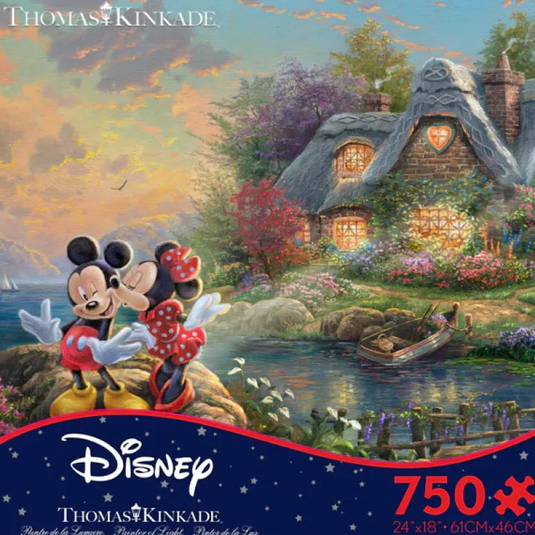 Thomas Kinkade Disney Collection is a group of paintings inspired by great moments from famous Walt Disney movies this 750 piece puzzle features Minnie Mouse kissing Mickey Mouse on the cheek in front of a cottage.