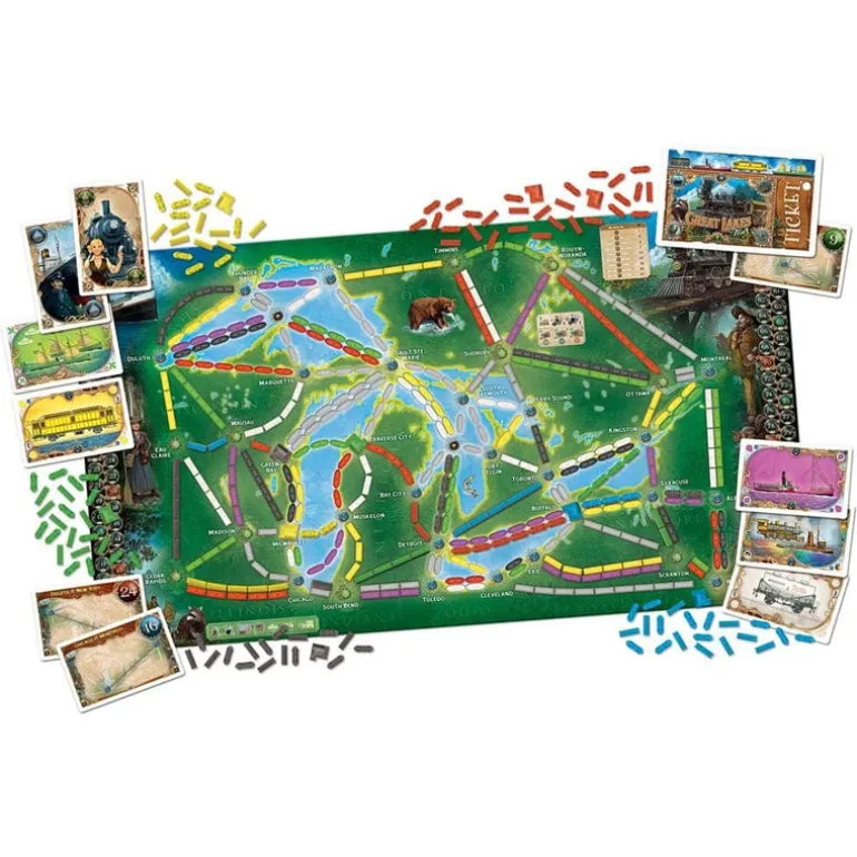 Players collect cards of various types (Trains and Ships) that enable them to claim railway and sea routes on a nicely illustrated double-sided board, featuring the world map on one side and the Great Lakes of North America on the other. Elegantly simple and fast to learn, it takes the Ticket to Ride series to the next level! Veteran railroaders as well as family and friends will be delighted to set sail to the new horizons of Ticket to Ride Rails and Sails.