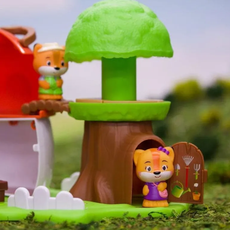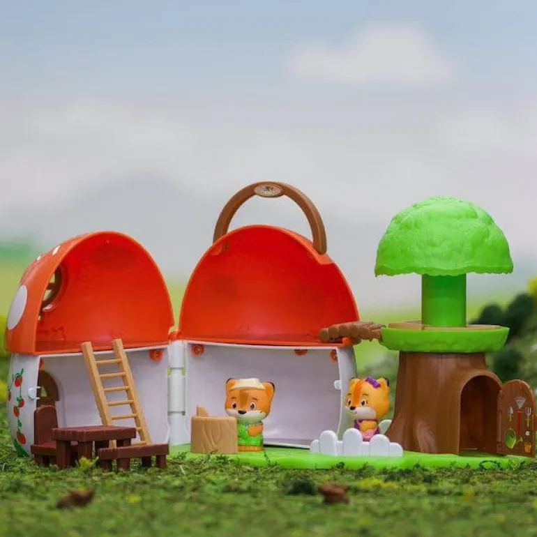 - Portable playset featuring a mushroom shop and a pop-open treetop