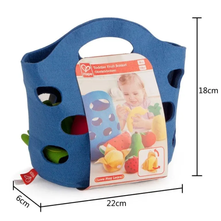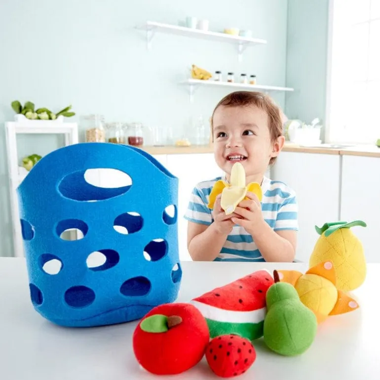 Fill this soft, felt basket with seven pieces of your favourite fruit. Peel the banana and the orange and share with your friends! Made of soft fabrics for babies’ fingers to grasp and hold.