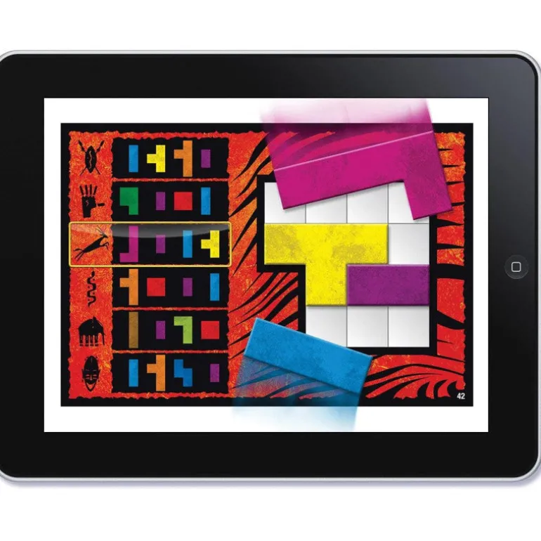 Ubongo by Grzegorz Rejchtman Ubongo is a fast-paced, addictive, and easy-to-learn geometric puzzle game. Players race against the timer and against each other to solve a puzzle of interlocking shapes. The faster you solve the puzzle, the more gems you get. The player with the most valuable gem treasure after nine rounds of solving puzzles wins! Here?s how it works: Each player receives a set of 12 tiles. The tiles are polyominos ? geometric shapes formed of equal-size squares joined edge to edge in different arrangements. At the start of each round, each player gets a new puzzle board. A roll of the die determines which tiles you must use to perfectly fill in the empty spaces on the puzzle board. Any players who complete the puzzle within the time limit yell out ?Ubongo!? and grab a gem at random from the bag. The fastest player also gets a blue gem and the second fastest an amber gem. Each gem color is worth a different amount of points. After nine rounds, the player with the most valuable gem