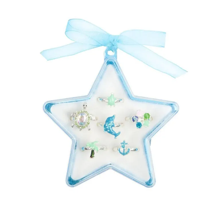 The deluxe water themed ring set features 6 adjustable rings. Set Includes: a baby green turtle, a larger turtle with gems, a glitter blue dolphin, gem flower, glitter palm tree and a glitter anchor in a blue star shaped keepsake box with a blue organza ribbon.
