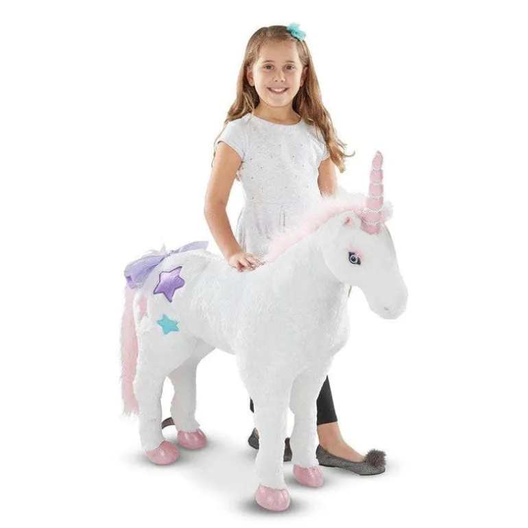 This graceful unicorn will prance right into any child’s collection — and heart! With its pretty pink mane and tail, both scattered through with shimmering silver strands that catch the light, this enchanting friend is sure to become a new favorite. Additional irresistible details include super-silky plush fur, satin star decorations, beautiful blue eyes, and a soft, shiny horn.