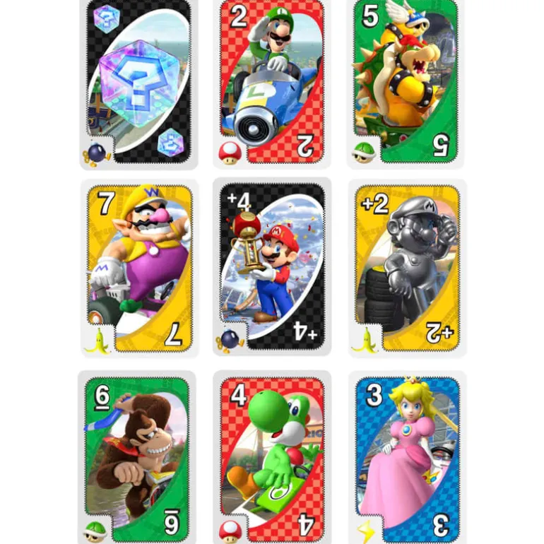 The UNO® matching card game everyone loves rides into the Mario Kart world of crazy obstacles and racing go-karts! Graphics from the game on every card make this unique pack a collectible for fans. It plays like classic UNO®, except every card has an ITEM icon in the corner (Mushroom, Banana Peel, Green Shell, Lightning, or Bomb). The ITEMS don’t do anything during normal play. But when the wild Item Box Card is played, the player flips over the top card of the Draw Pile and immediately uses the ITEM on that card! Each ITEM has a different action. This pack makes a great gift for players 7 years and older, especially Mario Kart fans.