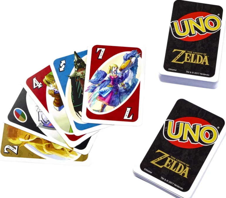 It’s the fun, fast-paced card game you love now featuring iconic characters from the Nintendo action/adventure video game series, The Legend of Zelda! Players race to get rid of all their cards by matching a card in their hand with the current card shown on top of the deck. Use the powerful Triforce Wild Card to control the game! When you play this card, you choose the color that will continue play, and the next player must play a card of that color with a Triforce symbol on it! If they don’t have one, they have to draw three more cards. Other action cards include Skips, Reverses, Draw Twos, and Wild Cards. First player or team to 500 wins and when you’re down to one card, don’t forget to yell ‘UNO!’ A great gift for Zelda fans, age 7 and older. Contains 112 cards plus instructions. For 2 to 10 players.