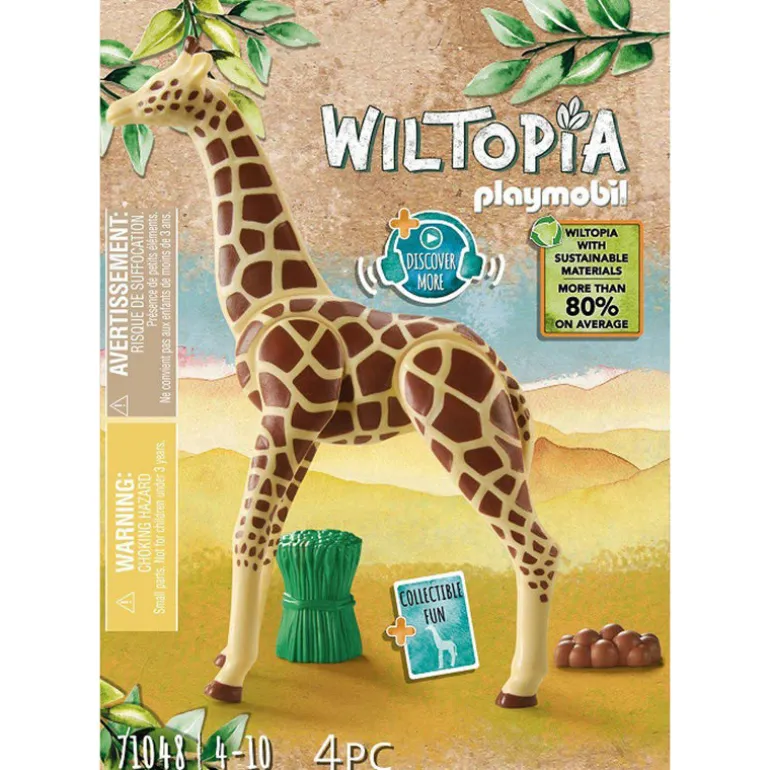 Reach the highest branches in the rainforest with the Giraffe. Using the enclosed collectible animal card with the Wiltopia app, kids can learn all about the animals and their habitats and even take a selfie with them by projecting the animals right into their home via AR. With Wiltopia – PLAYMOBIL’s eco-friendly product line consisting of, on average, more than 80% sustainable materials – children can embark on adventures to vibrant regions around the world, encouraging an appreciation for the wildlife that lives there and our planet as a whole. Play with this set on its own or combine it with the rest of the Wiltopia theme (#71048-71074, 71007-71012 – sold separately) for even more wild, animal fun! Set includes one giraffe, accessories, and corresponding animal card to unlock digital content. Recommended for ages four to ten years. Warning. Choking Hazard. Small parts. Not for children under 3 years.