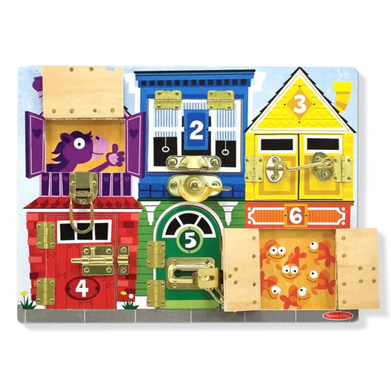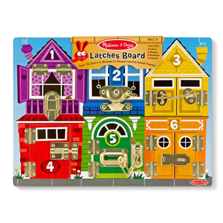Which animal friends are hiding behind the colorful doors? Undo a lock or latch, swing open the numbered door or window, and count on finding fun when the animal picture beneath is revealed. The Melissa & Doug Latches Board for toddlers is made from smooth-sanded, solid-wood material that features different kinds of latches sized just right for little hands. The windows and doors open up to reveal fun surprises that can keep children engaged while they practice important skills. The activity board is an educational toy that helps little ones build fine and gross motor skills while learning colors, shapes, numbers, animals and more! Parents and older kids can engage with children by playing multiple games including counting animals behind the doors and windows, locating specific colors, and identifying the type of animals displayed. The wooden activity board makes a great gift for preschoolers ages three and older for hands-on, screen-free play.