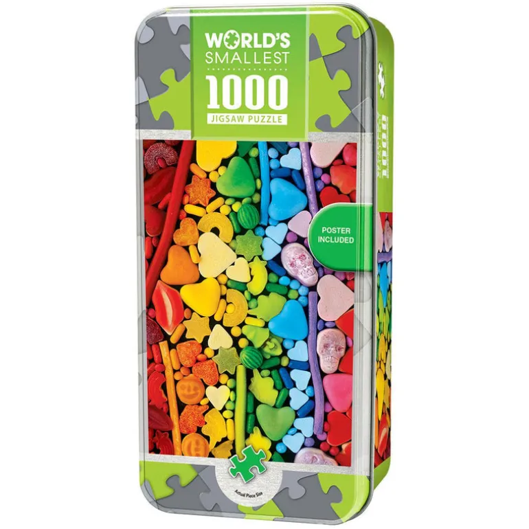 These MasterPieces 11.25″ x 16.75″ World’s Smallest 1000pc Puzzles are designed for both entertainment and ergonomics. Sold in a compact 4″ x 8″ collectible tin box, these puzzles will fit anywhere, and feature beautiful paintings and photography from some of the world’s most talented artists. The ultimate challenge awaits with the World’s Smallest 1000pc puzzle. Sweet treats can be found over the rainbow, this mini puzzle in collectible tin packaging will push the most experienced puzzler to the brink of their skills. To reduce their impact on our environment, the chipboard used in these puzzles is made of recycled material.