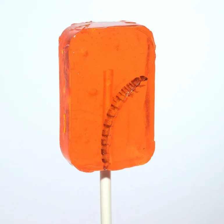 Real worm encased in hard candy suckers. Offered in five flavors: apple, blueberry, orange, watermelon, and tequila. Net wt. 1oz (31g).